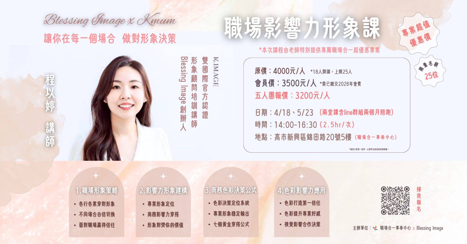 最新消息職場壓力職場領袖職能提升3/22(日)15:30 【職場色彩形象:用對顏色,專業就到位】程以婷 講師▋3/22 15:30 職場月例會|職場色彩形象講座 這一次,我們邀請到—— 程以婷 講師 從韓國正統 Personal Color…