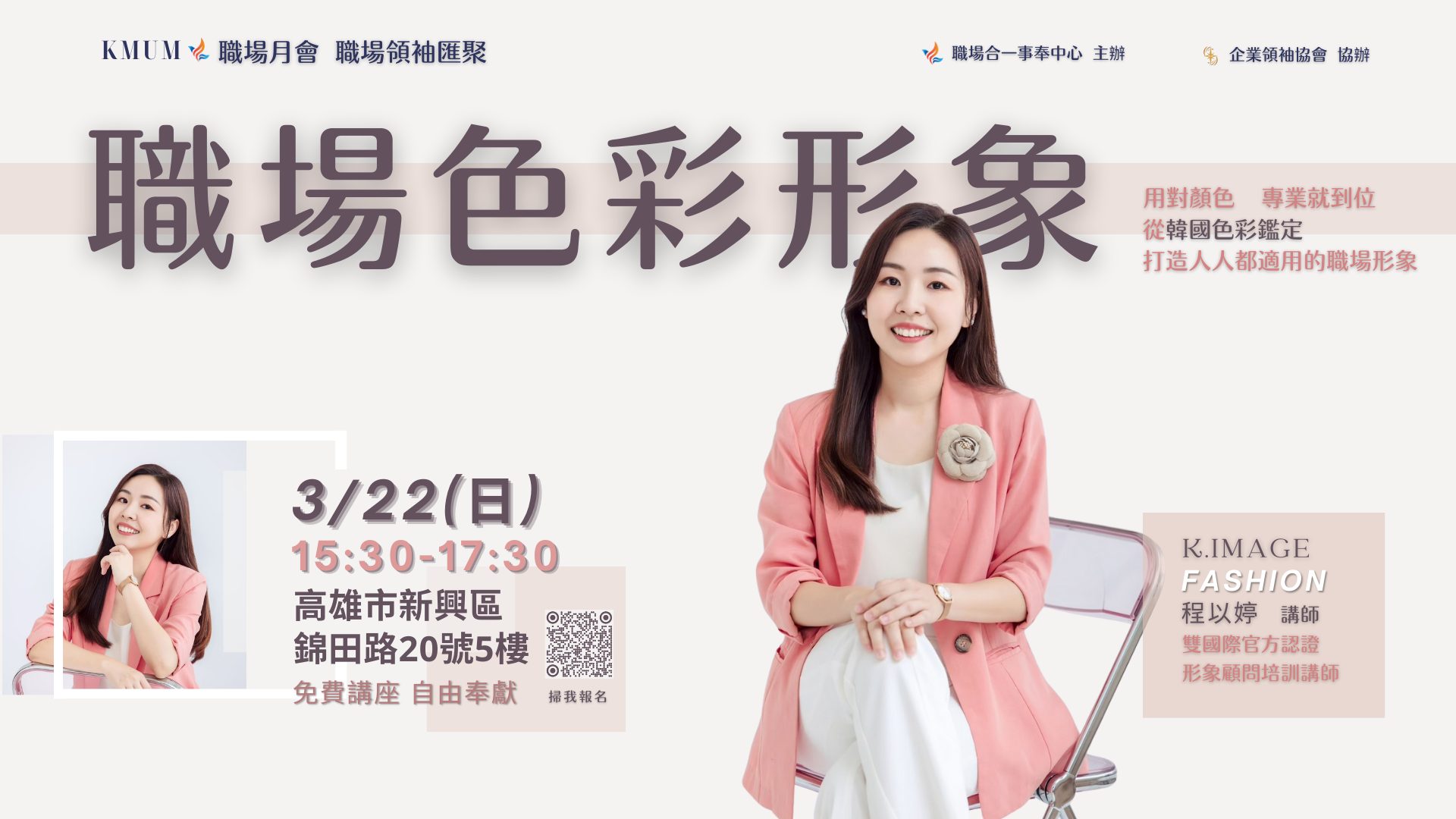 3/22(日)15:30 【職場色彩形象:用對顏色,專業就到位】程以婷 講師