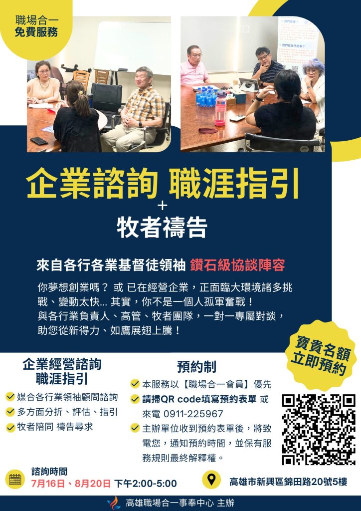 高雄市新興區錦田路20號5樓(高雄基督之家5樓,請先按【5F高雄職場合一事奉中心】門鈴)